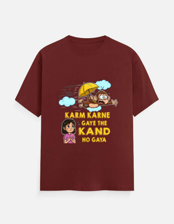 Add a dose of desi humor to your wardrobe with this premium round neck black t-shirt featuring a laugh-out-loud cartoon design. The graphic shows a panicked monkey flying away with an umbrella and a sad girl left behind – paired with the funny, relatable quote: “Karm Karne Gaye The Kand Ho Gaya.”